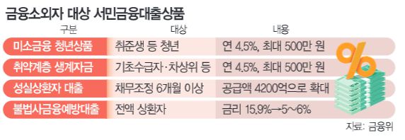 이날 금융위는 취약 계층을 대상으로 한 저리 대출 상품도 대폭 확대하겠다고 밝혔다. 우선 연 4.5%, 최대 한도 500만 원인 미소금융 금융취약계층 생계자금을 내년 출시할 계획이다. 이 상품은 연체자를 대상으로 한 소액 대출 정책 상품인 불법사금융예방대출을 모두 상환하면 이용할 수 있다. 불법사금융예방대출을 상환한 뒤에도 자금이 필요하지만 은행 등 제도권 금융기관에서는 여전히 대출을 받기 어려운 저신용자를 지원하기 위해 마련된 상품이다. 당국은 청년층을 대상으로 연 4.5%로 최대 500만 원의 급전을 빌려주는 미소금융 청년 상품도 내년 1분기 중 도입하기로 했다.