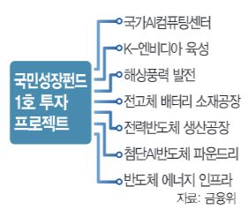 150조 원 규모로 조성하는 국민성장펀드의 1호 투자 프로젝트 7개도 공개됐다. 삼성전자 평택캠퍼스 5공장(P5) 건설과 관련된 반도체 에너지 인프라 프로젝트와 용인 반도체 클러스터와 연계된 첨단 인공지능(AI) 반도체 파운드리 프로젝트가 포함됐다. △AI 반도체 유니콘 10개를 만드는 K엔비디아 육성 △전남 해남의 국가 AI 컴퓨팅 센터 △전고체 배터리 소재 공장 △재생에너지 발전 △전력반도체 생산 공장도 담겼다.