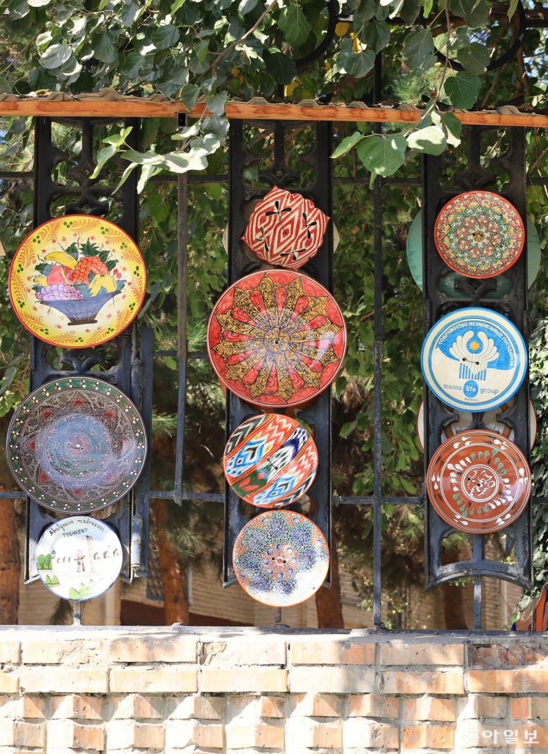 담장 위에 걸린 접시들이 햇살을 받아 저마다의 무늬를 뽐냅니다. 식탁 위 주연이던 형형색색의 개성 있는 접시들이 골목을 작은 미술관으로 바꿔 놓았네요.