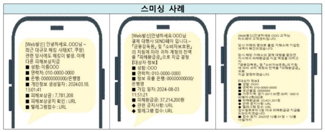안내문에 따르면 '피해 보상', '명의 도용', '카드 배송' 등 키워드를 활용해 피해보상 안내를 빙자하거나 수사기관을 사칭한 스미싱 및 보이스피싱 시도가 이어지고 있다. 특히 "피해 보상과 환급금을 받을 방법을 안내하겠다"는 스미싱 문자를 보내거나, 검찰과 경찰을 사칭해 "개인정보를 이용한 명의도용이 발생했으니 앱을 설치해 확인하라"는 식의 보이스피싱을 시도하는 사례가 이어졌다. 가짜 고객센터에 연결하며 개인정보를 추가 탈취하고 악성앱 설치를 유도하는 경우도 있었다.