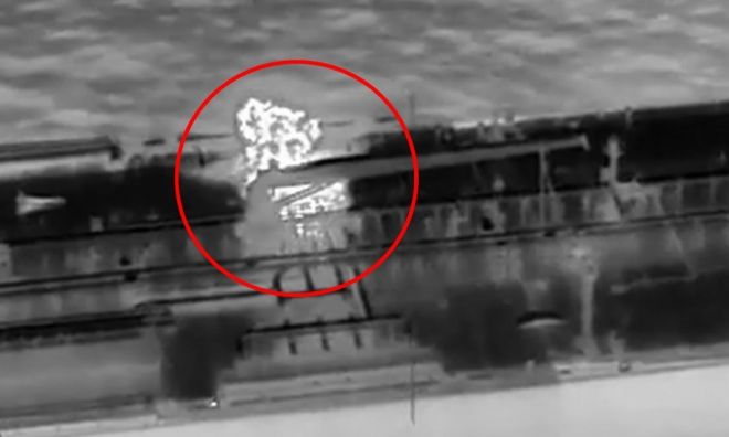 우크라이나군이 지중해 중립 해역에서 드론으로 러시아의 그림자 함대 유조선을 공격하는 모습. 영상 캡처