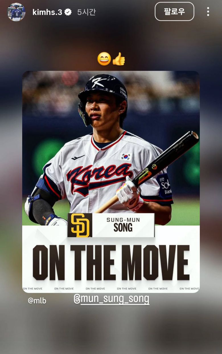 김혜성은 20일(한국시간) 자신의 인스타그램 계정에 송성문이 샌디에이고 파드리스와 계약을 맺었다는 소식을 전한 메이저리그 공식 인스타그램 계정의 게시물을 올리면서 웃음, 박수 이모티콘을 달았다.