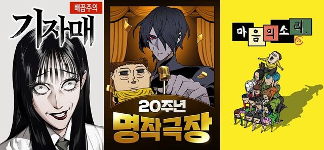 등장 작품은 '기자매'를 중심으로 '이말년 서유기', '가비지타임', '여신강림', '외모지상주의', '똑 닮은 딸', '유미의 세포들', '스위트홈', '마루는 강쥐', '타인은 지옥이다' 등 총 10편입니다.