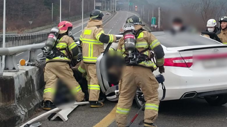경찰은 우회전 굽은 길에서 승용차가 보호 난간을 들이받고 사고가 난 거로 보고 있습니다.