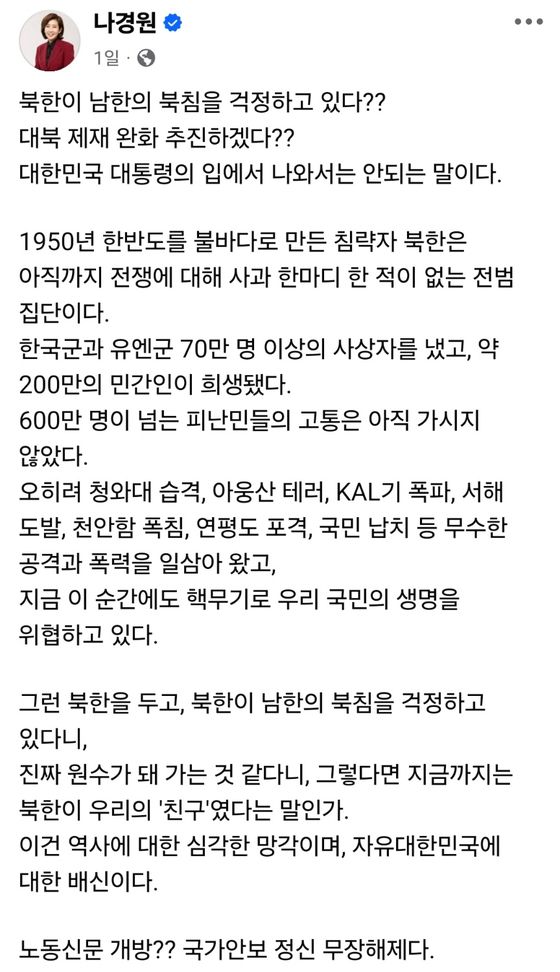 나경원 국민의힘 의원은 21일 페이스북에 “국가 안보 정신 무장해제”라며 “대통령 입에서 나와서는 안 되는 말”이라고 이재명 대통령의 북한 매체 공개 필요성 관련 발언을 비판했다.