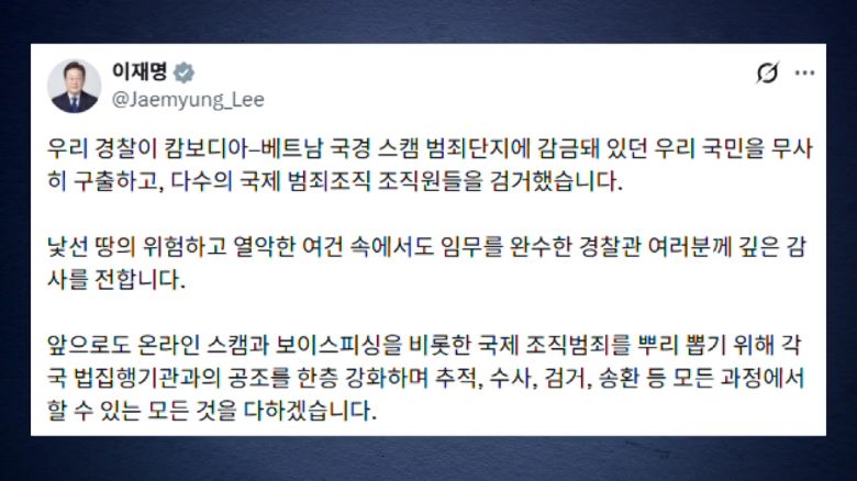 이재명 대통령은 우리 경찰이 캄보디아와 베트남 국경 스캠 범죄단지에 감금돼 있던 우리 국민을 무사히 구출한 데 대해, 깊은 감사를 드린다고 밝혔습니다.
