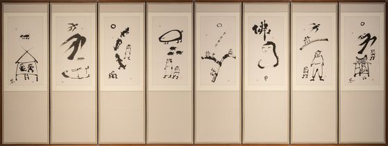 양주시립장욱진미술관의 ‘번지고 남아있는: 장욱진 먹그림’에 전시된 8폭 병풍. 장욱진의 먹그림으로 만들었다. [사진 양주시립장욱진미술관]