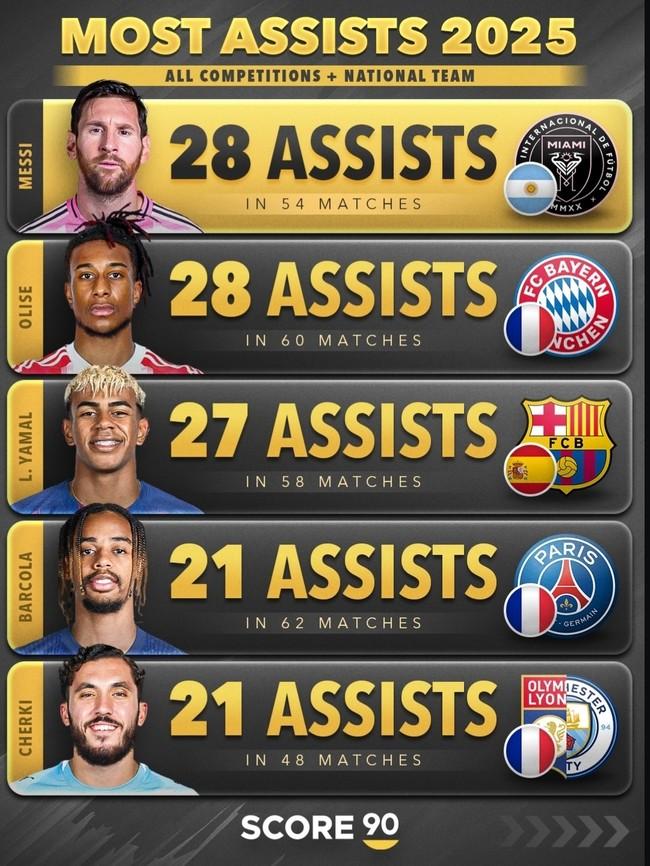 바르셀로나 후배인 라민 야말도 메시의 아성을 넘지 못했다. 만 18세의 야말은 이번 시즌 바르셀로나와 스페인 대표팀에서 27개의 도움을 기록했다. 라리가 최고의 윙어로 평가받고 있는 그조차 본인보다 20살 많은 메시의 기록을 넘어서지 못한 것이다.