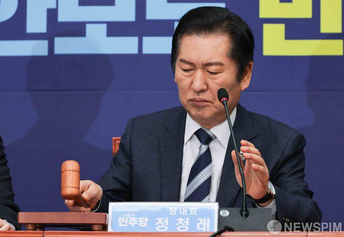 [서울=뉴스핌] 윤창빈 기자 = 정청래 더불어민주당 대표가 22일 서울 여의도 국회에서 열린 최고위원회의에서 의사봉을 두드리고 있다. 2025.12.22 pangbin@newspim.com