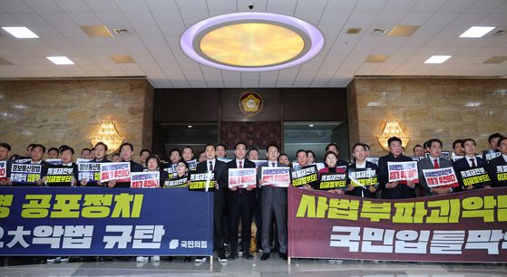 송언석 원내대표를 비롯한 국민의힘 의원들이 22일 서울 여의도 국회 본회의장 앞에서 가진 이재명 정권 사법부파괴-국민입틀막 악법 규탄대회에서 구호를 외치고 있다. 뉴스1 |