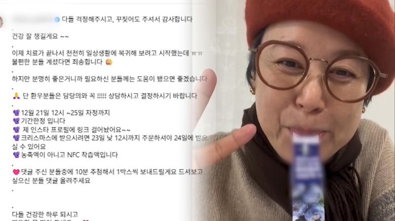 앞서 박미선은 어제(21일) SNS를 통해 건강즙을 마시는 영상을 올리며 공동구매 소식을 알렸습니다.