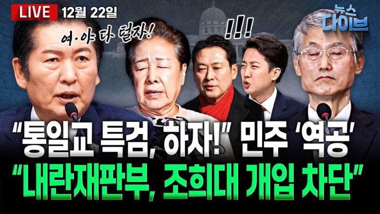 출연: 신용한 지방시대위원회 부위원장, 정구승 변호사, 이정주 CBS 기자, 진행: 고현준. 민주당의 ‘역공’ “통일교 특검 하자”... ‘2차 특검’도 시동 / “우리당 보배” 김문수-한동훈 뜬금 러브샷 내막은? / 윤 ‘김건희 보석 수수 바빠서 몰랐다’ 이번주 윤 부부 동반 기소! / ‘피의자’ 이준석, 특검 조사...“윤과 공범 엮기 무리한 시도” / ‘불통·국헌문란’ 용산 시대 마무리... 다시 청와대로. 오늘 (12월 22일) 뉴스 다이브 많은 시청바랍니다. 제작: 뉴스영상부