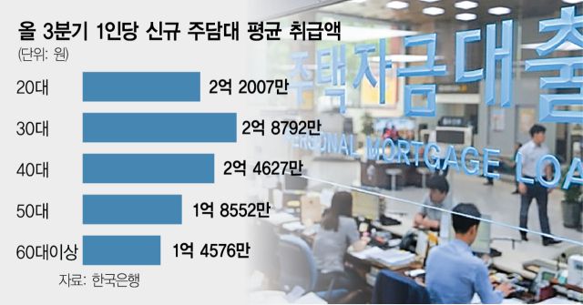 연령별로는 30대가 가장 큰 규모의 주담대를 일으킨 것으로 나타났다. 3분기 30대 차주의 주담대 신규 취급액은 1인당 평균 2억 8792만 원으로 전체 차주 평균보다 26.8% 많았다. 40대는 2억 4627만 원, 20대는 2억 2007만 원이었다. 전체 주담대 신규 취급액 가운데 30대가 차지하는 비중은 37.8%로 40대(28.8%)를 크게 웃돌았다.