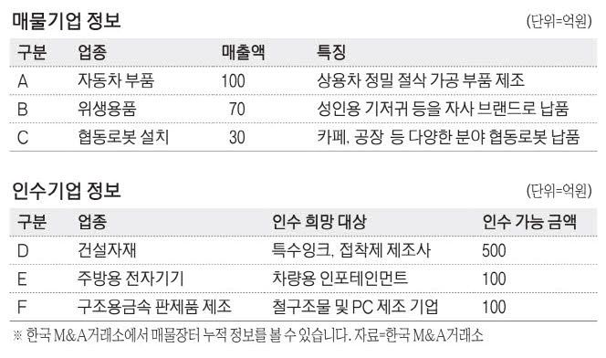 이외에 주방용 전기기기를 제조하는 외감기업 E사는 차량용 인포테인먼트 관련 업체를 100억원에, 반도체 클린룸용 패널을 제조하는 F사는 철구조물 및 프리캐스트 콘크리트(PC) 제조 기업을 100억원에 인수할 의사가 있다고 밝혔다.