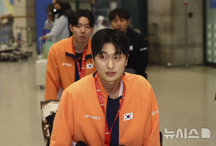 [인천공항=뉴시스] 김근수 기자 = 세계배드민턴연맹(BWF) 월드 투어 파이널 대회에서 우승을 차지한 남자복식 김원호와 서승재가 22일 인천 중구 인천국제공항 제1여객터미널을 통해 귀국하고 있다. 2025.12.22. ks@newsis.com