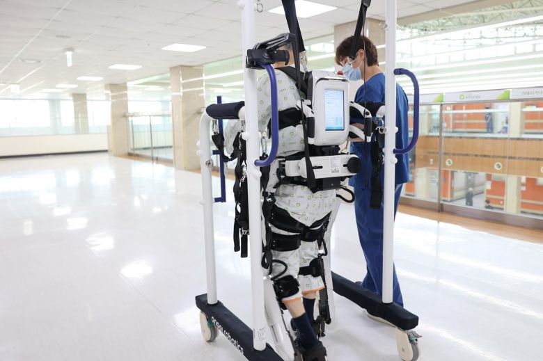 보행재활로봇을 통해 재활 치료를 받고 있는 보훈병원 환자.