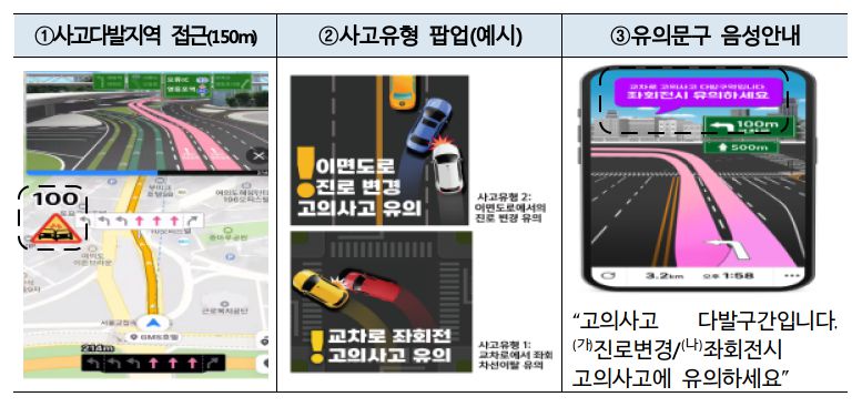 안내 방식도 강화된다. 기존에는 사고 다발 지역 진입 직전 약 15m 지점에서 음성안내가 이뤄졌지만, 앞으로는 진입 150m 전부터 안내가 시작된다. 또 해당 지역에서 빈번하게 발생하는 사고 유형(진로 변경, 좌회전 고의사고 등)을 팝업 형태로 추가 안내해 운전자 경각심을 높인다.