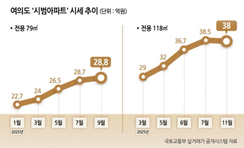 가격 흐름도 강세다. 국토교통부 실거래가 공개시스템에 따르면 대교아파트 95㎡(이하 전용면적)는 지난 11월 6일 32억7000만원(5층)에 거래됐다. 공급평수가 30평인걸 고려하면 평당 1억원이 넘는 거래가 체결된 셈이다. 여의도는 2021년 4월부터 토지거래허가구역으로 지정돼 있어 실제 거래 시점은 계약 체결 이후 약 한 달의 시차가 발생한다.