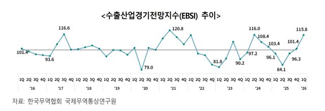 한국무역협회(KITA) 국제무역통상연구원은 23일 ‘2026년 1분기 수출산업경기전망지수(EBSI)’ 보고서를 통해 내년 1분기 EBSI가 115.8을 기록했다고 밝혔다. 이는 지난 2024년 2분기 이후 7분기 만에 처음으로 110을 상회한 수치다. EBSI는 100을 기준으로 전 분기보다 개선될 것으로 예상되면 100보다 높고 악화될 것으로 전망되면 100보다 낮다.