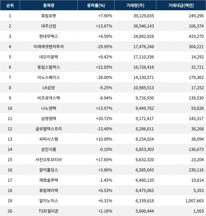 한편 거래량 상위 20위권 종목들은 삼영엠텍(054540) ▲20.72%, 글로벌텍스프리(204620) ▼13.40%, 씨피시스템(413630) ▲10.89%, 삼진식품(0013V0) ▼0.10%, 서진오토모티브(122690) ▲17.65%, 원익홀딩스(030530) ▲3.86%, 재영솔루텍(049630) ▼1.45%, 휴림에이텍(078590) ▲8.53%, 알지노믹스(476830) ▲6.31%, TS트릴리온(317240) ▲2.16% 등의 성적을 기록하고 있다.
