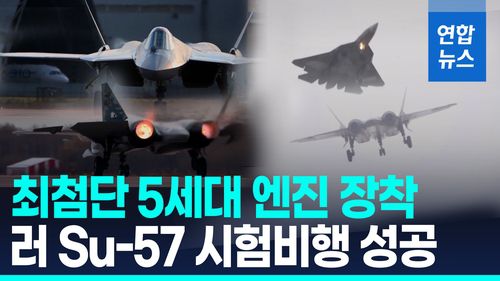 (서울=연합뉴스) 러시아의 5세대 최신예 스텔스 전투기 수호이(Su)-57이 최첨단 신형 엔진을 장착하고 첫 시험 비행에 성공했습니다.