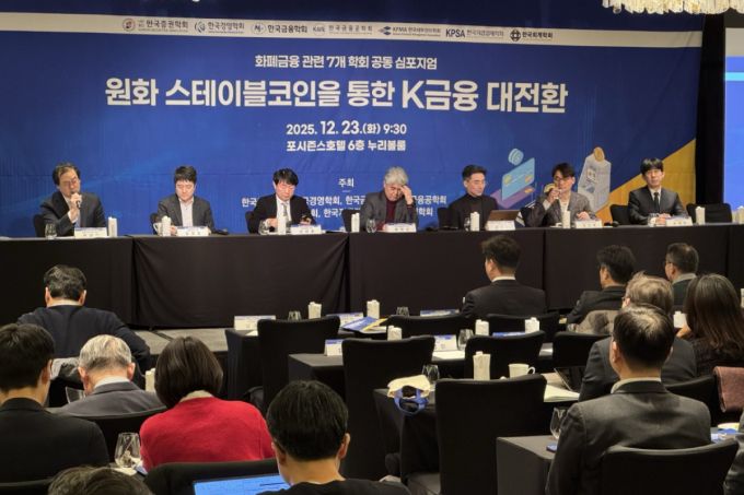 23일 서울 광화문 포시즌스호텔에서 한국증권학회·한국경영학회·한국금융학회·한국금융공학회·한국재무관리학회·한국지급결제학회·한국회계학회 공동으로 열린 '원화 스테이블코인을 통한 K금융 대전환' 심포지엄./사진=성시호 |