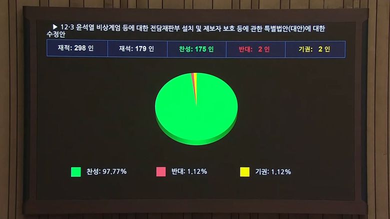 <우원식 / 국회의장> "찬성 175인, 반대 2인, 기권 2인으로서 12.3 윤석열 비상계엄 등에 대한 전담재판부 설치 및 제보자 보호 등에 관한 특별법안 대안에 대한 수정안은 가결되었음을 선포합니다. (땅! 땅! 땅!)"