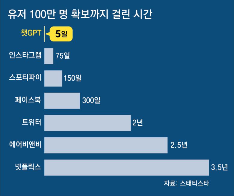 전환점은 2019년이었다. 마이크로소프트로부터 10억 달러 투자 유치에 성공하며 ‘상한 이익(capped profit)’ 구조의 영리 자회사를 설립했다. 2022년 11월 30일 출시된 챗GPT는 역사상 가장 빠르게 성장한 애플리케이션으로 기록되며 게임의 판도를 바꿨다. 복잡한 AI 기술을 누구나 쉽게 쓸 수 있는 대화형 인터페이스로 만들어 낸 것이다. 출시 5일 만에 100만 명, 2개월 만에 1억 명의 사용자를 확보했다. 이후 GPT-4(2023년)를 거쳐 GPT-5.2(2025년)를 출시하며 오픈AI를 단순한 연구 조직에서 자본과 시장의 중심에 선 ‘AI 제국’으로 탈바꿈시켰다.