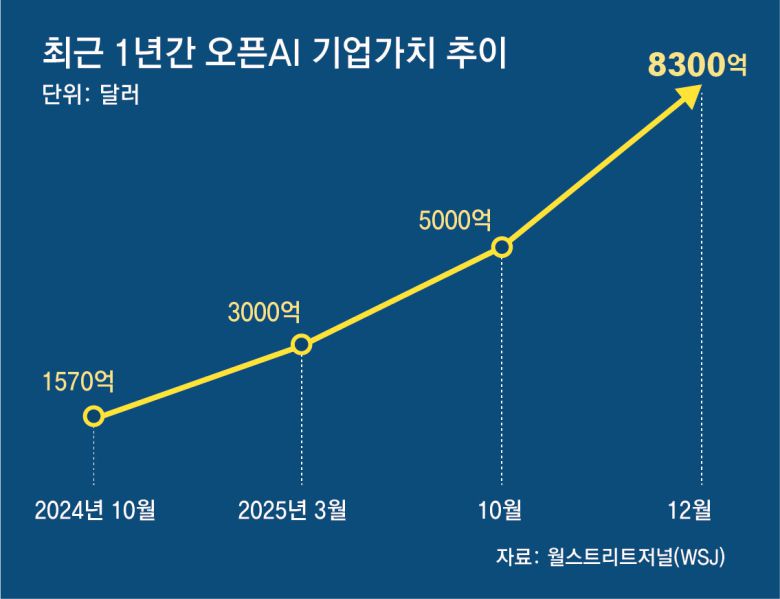 불과 1년 전인 2024년 10월 오픈AI의 기업가치는 1570억 달러에 불과했다. 그러나 2025년 들어 세 차례에 걸쳐 몸값이 급등했다. 3월 3000억 달러, 10월 5000억 달러를 거쳐 연말에는 8000억 달러 선을 넘보게 됐다. 1년여 만에 기업가치가 다섯 배 이상 뛰는, 월가에서도 보기 드문 성장 궤적을 보인 것이다.