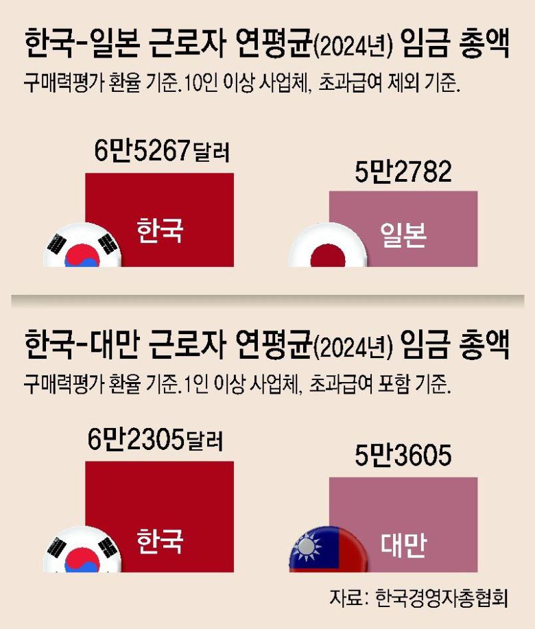 대만과 비교했을 때도 지난해 기준 우리나라 임금근로자 연 임금총액(초과급여 포함)은 6만2305달러로 대만의 5만3605달러보다 16.2% 높았다. 2011∼2024년 한국의 임금이 70.8% 점프할 때 대만은 54.4% 상승하는 데 그친 결과다.
