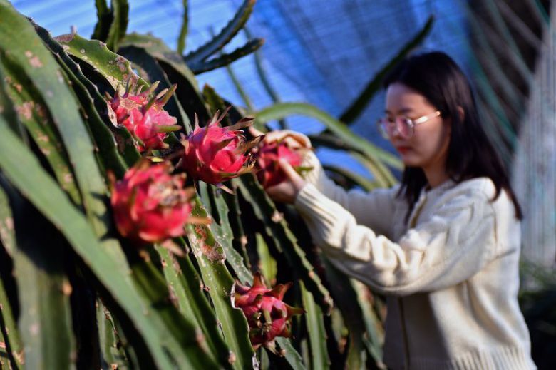 중국이 캐비아, 푸아그라, 송로버섯 등 고급 식자재 시장에서도 세계 주요 공급국으로 부상하고 있다. 지난 6일 산둥성 옌타이에서 한 여성이 용과를 따고 있다. 신화 연합