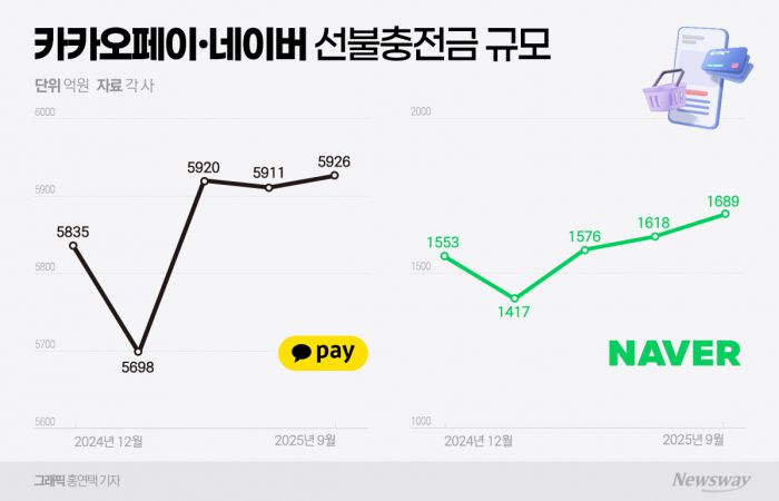 24일 정보기술(IT) 업계에 따르면 올해 3분기 말 카카오페이와 네이버페이의 선불충전금 잔액은 7615억원으로 집계됐다. 1년 전인 지난해 9월 말(7115억원) 대비 7.0% 증가한 수준이다. 선불충전금 규모는 카카오페이, 증가 폭은 네이버페이가 더 컸다. 카카오페이는 작년 3분기 말 5698억원에서 올 9월 말 5926억원으로 4.0% 늘었다. 같은 기간 네이버페이는 1417억원에서 1689억원으로 19.2% 급증했다.
