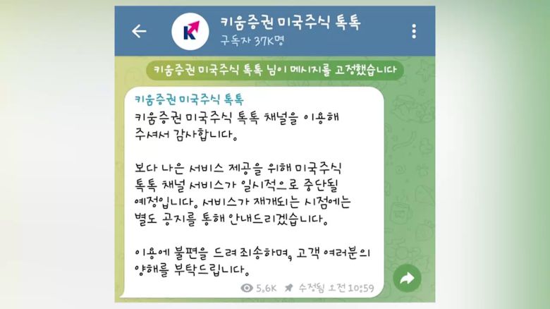 키움증권 미국주식 텔레그램 채널인 '키움증권 미국주식 톡톡'은 어제(23일) "보다 나은 서비스 제공을 위해 서비스가 일시적으로 중단될 예정"이라며 "서비스가 재개되는 시점은 별도 공지를 통해 안내하겠다"고 밝혔습니다.