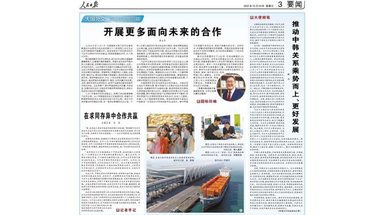 인민일보는 같은 지면에 한중의원연맹 회장인 김태년 더불어민주당 의원의 기고문도 나란히 실었습니다.