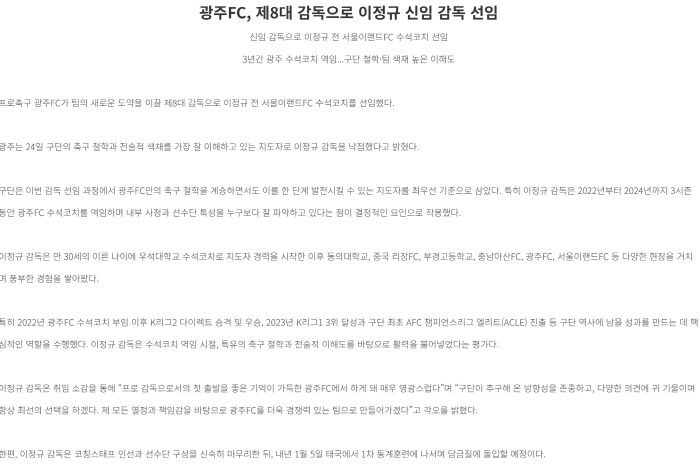 이정효 감독을 떠나보낸 광주FC가 이날 오후 '제8대 감독으로 이정규 전 이랜드 수석코치를 선임했다'고 공식발표했다. '2022년 광주FC 수석코치 부임 이후 K리그2 다이렉트 승격 및 우승, 2023년 K리그1 3위 달성과 구단 최초 AFC 챔피언스리그 엘리트(ACLE) 진출 등 구단 역사에 남을 성과를 만든 지도자'라고 선임 배경을 설명했다. 이정규 감독은 취임 소감을 통해 "프로 감독으로서의 첫 출발을 좋은 기억이 가득한 광주FC에서 하게 돼 매우 영광스럽다"며 "구단이 추구해 온 방향성을 존중하고, 다양한 의견에 귀 기울이며 항상 최선의 선택을 하겠다. 제 모든 열정과 책임감을 바탕으로 광주FC를 더욱 경쟁력 있는 팀으로 만들어가겠다"고 각오를 밝혔다.