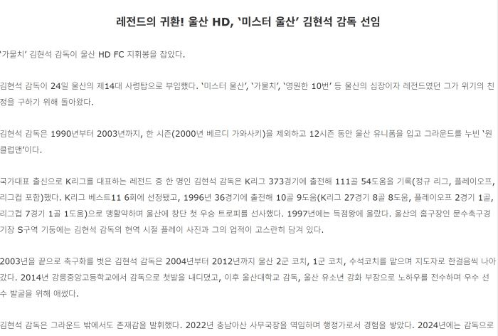 이어 울산HD가 "레전드의 귀환! 울산 HD, '미스터 울산' 김현석 감독 선임"이라는 제하에 울산 레전드 김현석 감독의 제14대 사령탑 부임 소식을 알렸다. "과거 구단을 위한 헌신과 업적, 현재 구단에 관한 이해도, 선수들과 함께하는 리더십, 전술·전략 등 모든 역량을 신중히 검토한 끝에 김현석 감독이 적임자라고 판단했다"면서 "그동안 현장과 행정 경험을 두루 쌓은 그가 청춘을 바쳤던 울산으로 돌아와 명가 재건을 위해 혼신의 힘을 다하기로 했다"고 밝혔다.