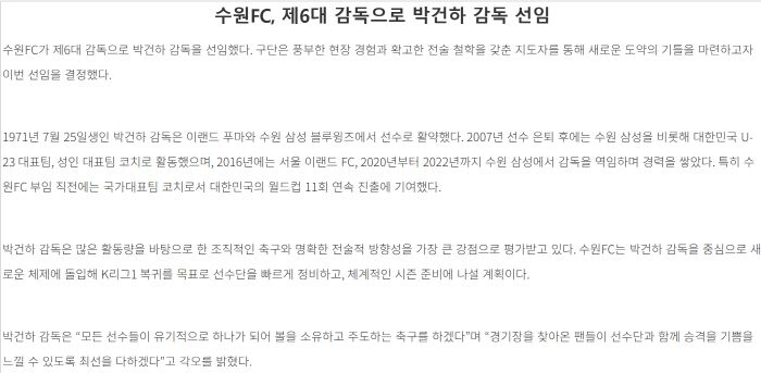 수원FC 사무국도 바쁘게 움직였다. '샤프' 김은중 감독과의 결별 '오피셜'을 낸 이날 오후 늦게 '제6대 감독으로 박건하 전 수원 삼성 감독을 선임했다'는 소식을 공식화하면서 "수원FC는 박건하 감독을 중심으로 새로운 체제에 돌입해 K리그1 복귀를 목표로 선수단을 빠르게 정비하고, 체계적인 시즌 준비에 나설 계획"이라고 밝혔다. 박건하 감독은 "모든 선수들이 유기적으로 하나가 되어 볼을 소유하고 주도하는 축구를 하겠다. 경기장을 찾아온 팬들이 선수단과 함께 승격을 기쁨을 느낄 수 있도록 최선을 다하겠다"는 각오를 전했다.