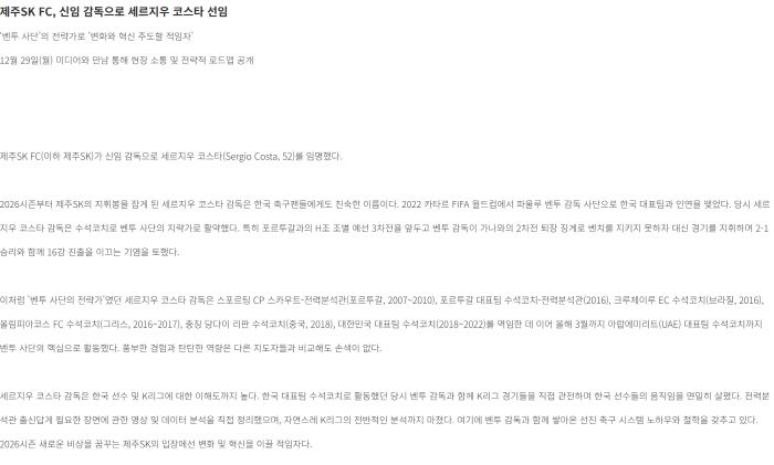이어 제주 SK가 '벤투 사단의 전략가'의 세르지우 코스타 신임 감독을 선임했다는 뉴스가 전해졌다. 코스타 감독은 "2018년부터 시작한 한국에서의 삶은 정말 최고였다. 한국을 떠난 뒤 사람, 생활, 음식 모든 부분이 다 그리웠다. 가족들도 내게 다시 한국에 가고 싶다는 말을 했을 정도였다. 무엇보다 한국 팬들에게 정말 뜨거운 사랑을 받았다. 다시 한국으로 돌아와 K리그라는 무대에서 그 사랑에 보답할 수 있는 기회를 준 제주SK에게 정말 감사하다는 말을 전하고 싶다. 첫 감독이라는 새로운 도전을 제주SK의 모든 구성원들과 함께 할 수 있어 크나큰 영광이다. 2025시즌 제주SK가 정말 힘들었다는 것도 잘 알고 있기에 책임감과 동기부여는 그 어느 때보다 크다. 정말 진심을 다해 제주SK의 지휘봉을 잡도록 하겠다"라고 취임 일성을 전했다.