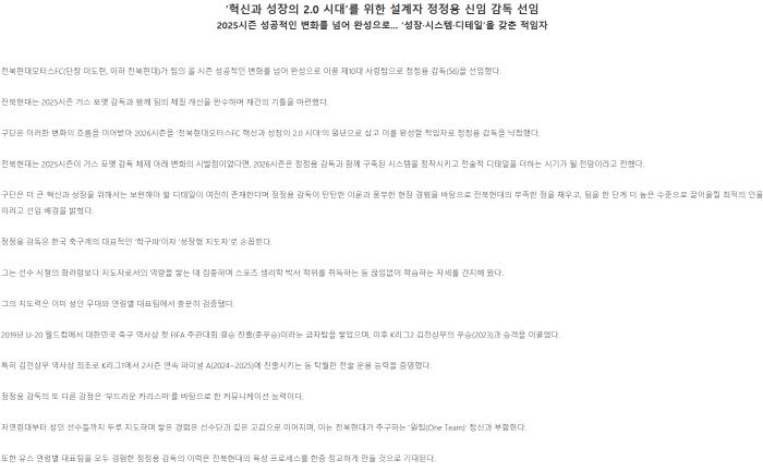 곧이어 전북 현대가 "'혁신과 성장의 2.0 시대'를 위한 설계자 정정용 신임 감독 선임" 오피셜을 냈다. 정정용 신임 감독은 "K리그 최고의 명문 구단인 전북현대의 지휘봉을 잡게 되어 영광이며 무거운 책임감을 느낀다"며 "거스 포옛 감독이 닦아놓은 기반 위에 나만의 디테일을 더해, 팬들이 자부심을 느낄 수 있는 축구를 선보이겠다"는 각오를 전했다. '김천상무에서 정정용 감독과 함께 팀을 이끌었던 성한수 공격 코치를 비롯해 이문선 수비코치, 심정현 피지컬 코치와 전북현대 선수 출신인 서동명 GK 코치가 팀에 합류한다'는 소식도 함께 전해졌다.