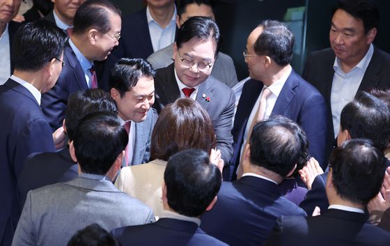 장동혁 국민의힘 대표(가운데)가 지난 23일 국회 본회의에서 필리버스터(무제한 토론)를 마친 뒤 동료의원들과 인사하고 있다. 임현동 기자. |