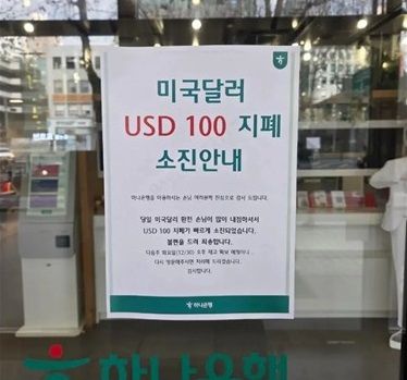 24일 금융권에 따르면 서울 강남 지역 하나은행 지점 한 곳은 이날 미화 100달러 지폐가 소진됐다는 안내문을 게시했다.