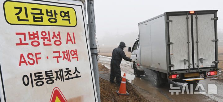 [여주=뉴시스] 김종택 기자 = 사진은 지난 1월 6일 고병원성 조류인플루엔자(AI)가 발생한 경기 여주시 흥천면 한 산란계 농장 인근 이동통제초소에서 방역 관계자가 차량 방역작업을 하고 있는 모습. 2025.01.06. jtk@newsis.com |