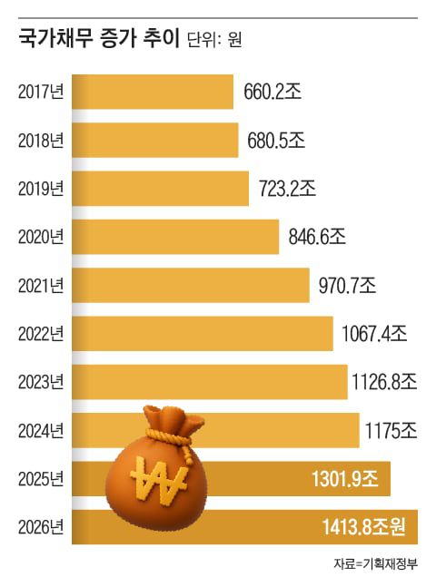 한국도 마찬가지다. 코로나 대응한다고 2020년 역대 처음으로 재정 적자가 100조원을 넘기더니 그 추세가 계속된다. 세수보다 지출이 많아 올해 말 국가 채무는 1300조원을 넘기고 국가 채무 비율은 코로나 이전인 2019년 35.4%보다 15%포인트 가까이 오른 49.1%를 기록하게 된다. 여기에 이재명 정부는 ‘확장 재정’이라는 가속페달마저 밟고 있다. 내년 예산안을 보면, 재정 적자는 108조원에 연말이면 국가 채무는 1413조원에 달하고 국가 채무 비율은 처음 50%를 넘는다.