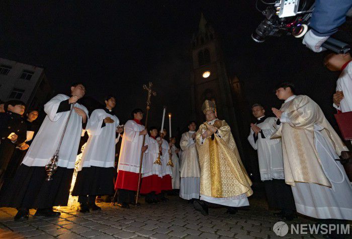 [서울=뉴스핌] 최지환 기자 = 천주교 서울대교구장 정순택 대주교가 성탄절인 25일 서울 중구 명동대성당 앞마당에서 주님 성탄 대축일 밤 미사를 앞두고 아기 예수를 말 구유에 안치하는 '구유 예절' 의식을 하고 있다. 2025.12.25 choipix16@newspim.com