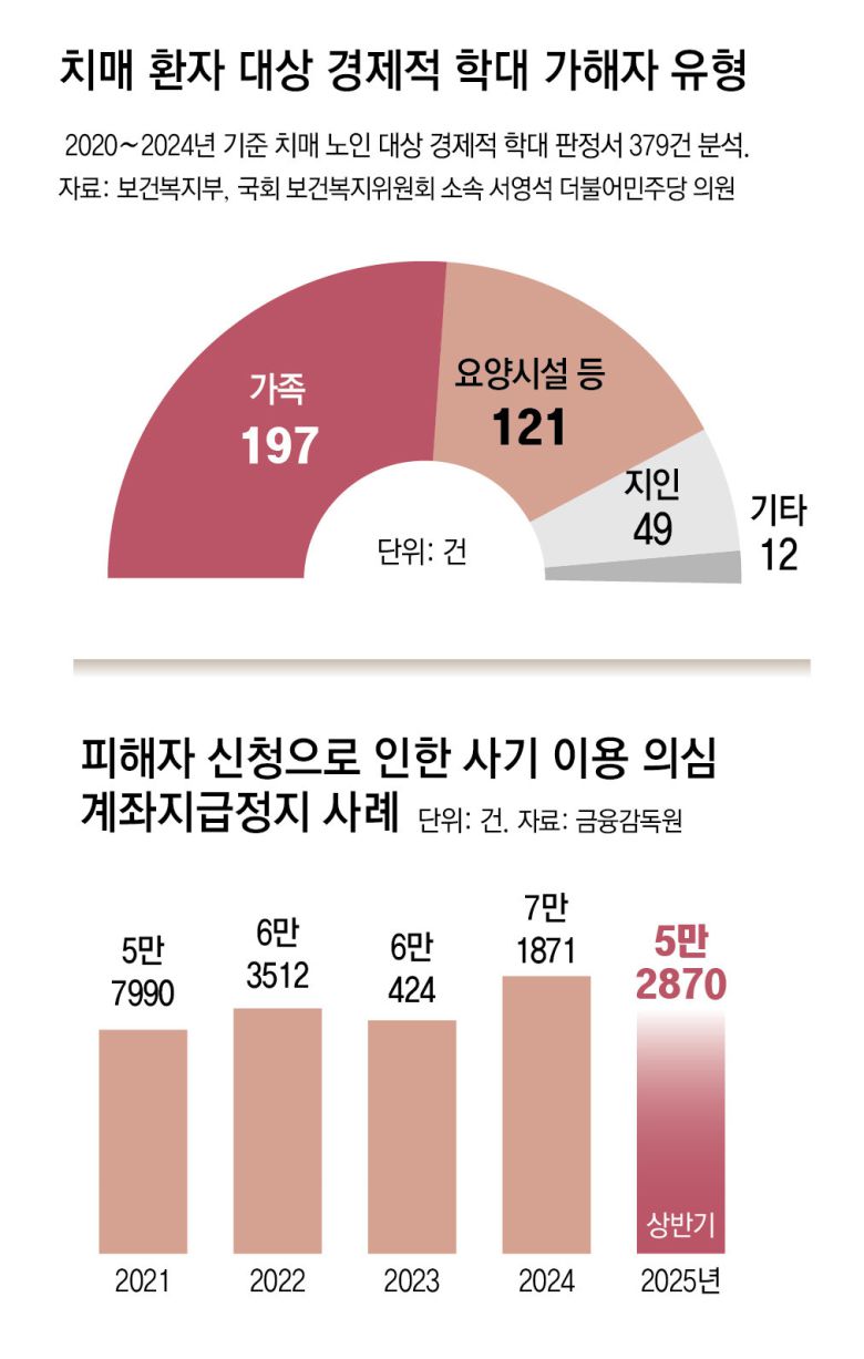 치매 노인의 자산을 노리는 사냥꾼 대다수는 피해자의 곁을 지키며 언제든 통장과 도장을 손에 넣을 수 있는 이들이다. 실제 노인보호전문기관이 2020년부터 5년간 조사한 치매 노인 대상 경제적 학대 판정서 379건을 분석한 결과 가장 큰 비중을 차지한 건 아들딸 등 가족(52.0%)이었다. 요양원·요양병원 등 시설 종사자(31.9%)와 이웃 등 지인(11.9%)이 그 뒤를 이었다. 379건 중 126건은 치매 노인의 통장 비밀번호를 알아낸 뒤 연금 등을 몰래 빼돌리는 ‘기생형’이었다. 하지만 은행의 허술한 현금 인출 구조로 인해 이를 막지 못하는 셈이다.