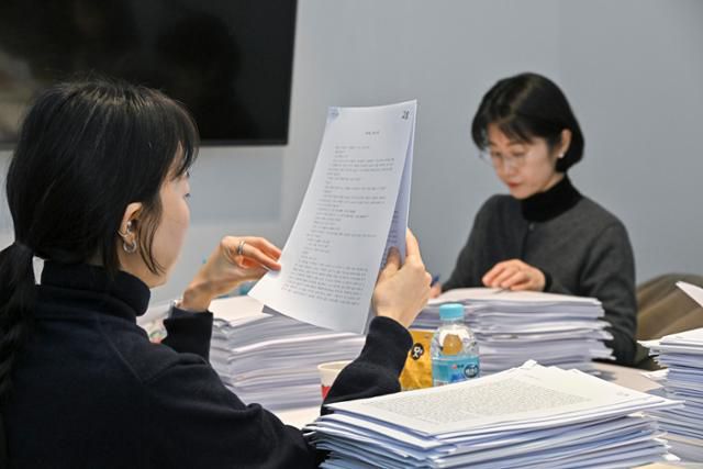 손보미(왼쪽) 소설가와 조연정 문학평론가가 14일 서울 중구 한국일보에서 2026 신춘문예 소설 부문 응모작을 살펴보고 있다. 정다빈 기자