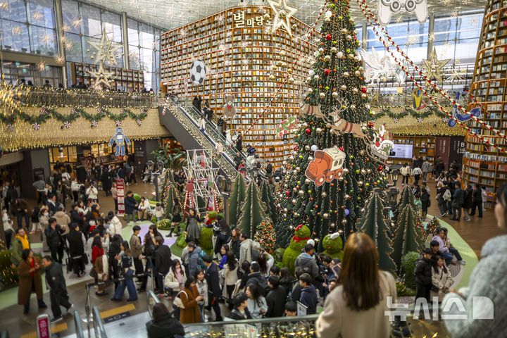 [서울=뉴시스] 정병혁 기자 = 크리스마스를 하루 앞둔 24일 서울 강남구 코엑스를 찾은 시민과 여행객들이 크리스마스 트리 앞에서 사진을 찍으며 즐거운 시간을 보내고 있다. 2025.12.24. jhope@newsis.com