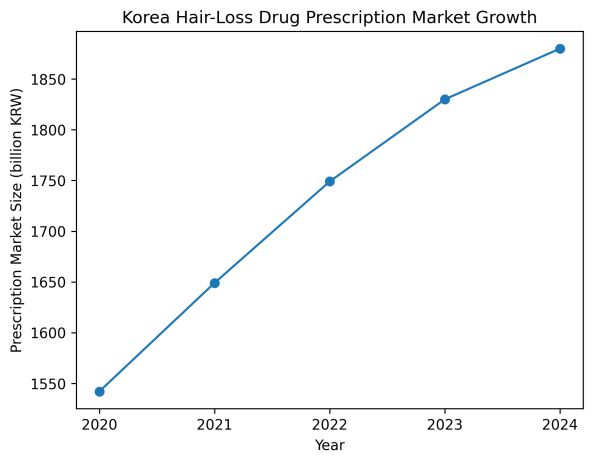 According to IQVIA the size of Korea’s hair-loss treatment market reached 1.88 trillion won last year. Prescription spending on hair-loss drugs increased from 1.542 trillion won in 2020 to 1.649 trillion won in 2021, 1.749 trillion won in 2022, 1.83 trillion won in 2023, and 1.88 trillion won last year. These figures cover prescription drugs used to treat androgenetic alopecia.