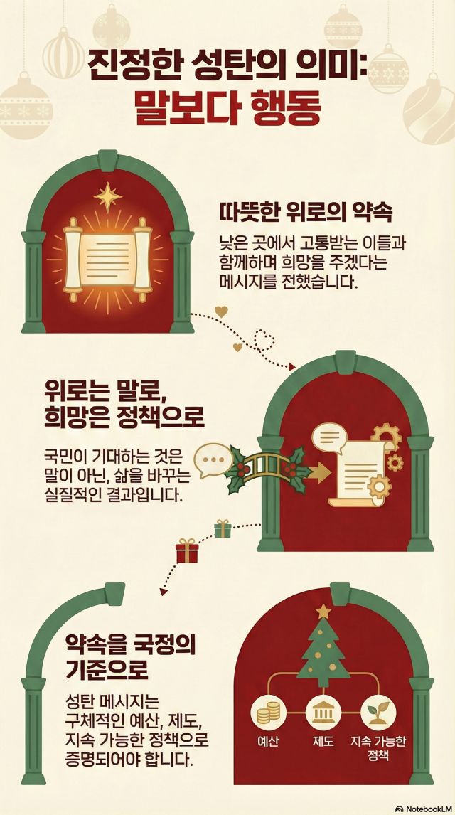 성탄절은 매년 돌아온다. 하지만 매년 같은 질문을 던진다. 권력은 누구를 향해 사용되고 있는가, 국정의 중심은 어디에 놓여 있는가. 대통령의 메시지가 이 질문에 대한 방향을 제시했다면, 이제 남은 것은 실행이다. 성탄의 언어가 연말의 인사에 머물지 않고, 새해의 국정 운영을 가르는 기준으로 작동할 때 비로소 그 약속은 힘을 갖는다.