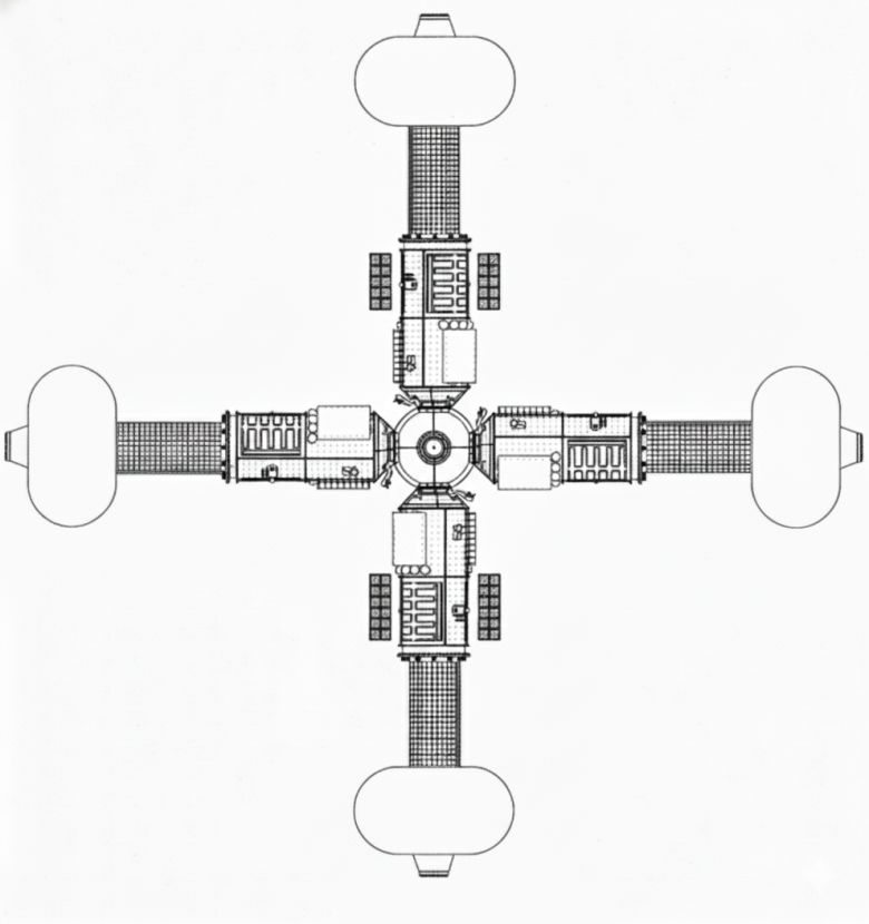 특허 상세 문서를 보면 에네르기아 우주정거장은 십(十)자와 비슷한 형상이다. 중심축에 기다란 막대기 형상의 인간 거주 공간 4개가 90도 각도를 유지하면서 부착돼 있다.